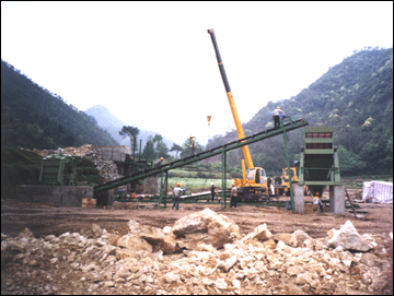 首先,石料由給料機均勻地送進粗碎機進行初步破碎,然后,產(chǎn)成的粗料由皮帶輸送機輸送至反擊式破碎機進行進一步破碎,細碎后的石料進振動篩篩分出不同規(guī)格的石子,不滿足粒度要求的石子返料進