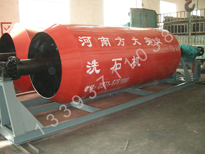 圓筒洗石機清洗筒體被四個拖輪支撐,電機帶動減速機,大小齒輪帶動清洗筒體低速旋轉。含有泥團和石粉的骨料自進料口給入,進入旋轉的回轉滾筒清洗機滾筒內,被清洗滾筒內安裝有一定角度的耐磨橡膠襯板不斷帶起拋落,自進料端到出料端移動過程中多次循環,并被順向或逆向的沖洗水沖涮洗滌,清洗干凈的骨料經過卸料端筒篩篩分脫水后排出。含有污泥的廢水則通過出料或給料端的帶孔擋板流出。
